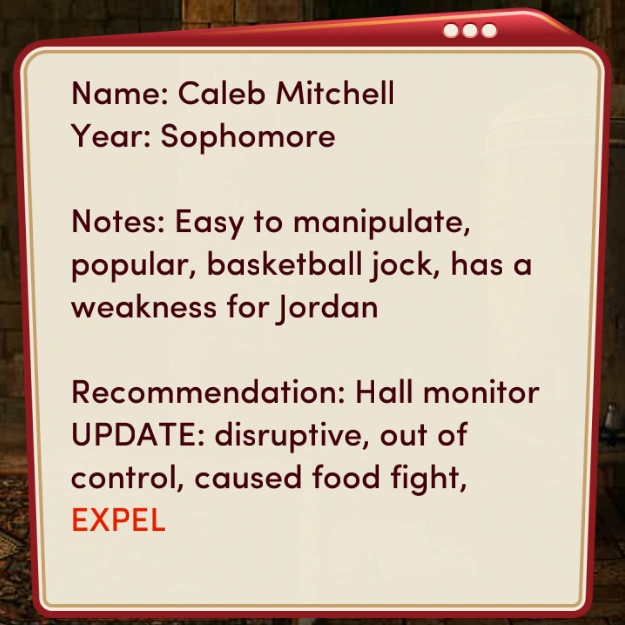 He is kind and friendly to you when you first meet him, offering you help you around the school. You can hang out with him in the pool in Chapter 2. If you choose to warn Caleb before he finds out that his girlfriend is cheating on him with his best friend, he will be grateful. If you choose not to warn him, he will admonish you. If you choose to comfort him at the cliff after he leaves the party you develop a stronger bond with him. You are close friends and work together to find a new quarterback for the football team. You can choose to go to the movies with Caleb, of which you will develop your relationship further.