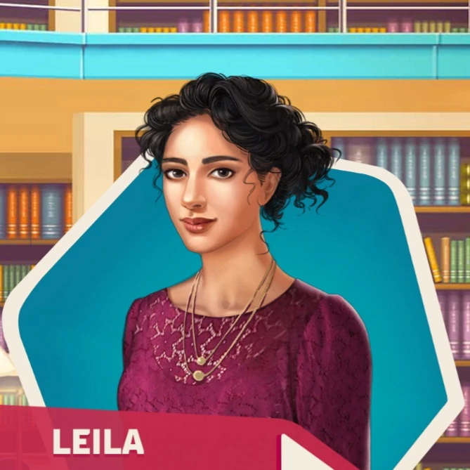 Leila has black, wavy hair, which she wears pulled into a bun. Her skin is tanned and her eyes are brown. She wears a wine red blouse and a double-stranded gold necklace.
