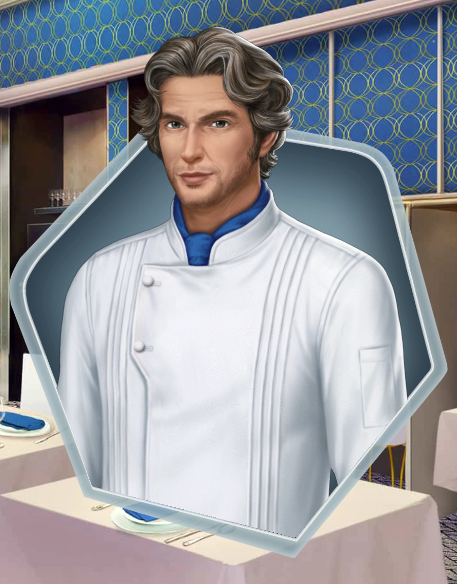 He is the wedding caterer. He initially tries to suggest blue napkins and pesto, but you remind him to follow Lucia's preferences and allergy. His character model resembles Antoine Duval from Slow Burn.