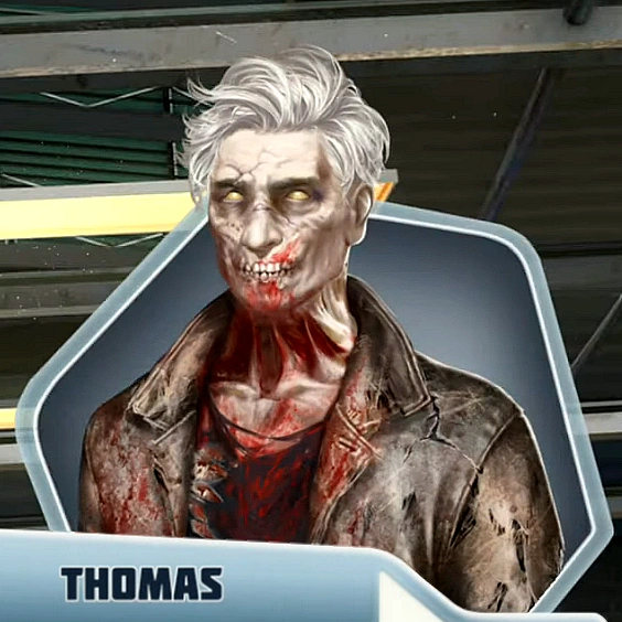 Thomas has blue eyes, short white hair, and pale skin with light stubble. He has scars across the right half of his face. He wears a faded black t-shirt and a weathered brown leather jacket. A series of spasms can distort his face and he may blink erratically, his eyes out of sync.